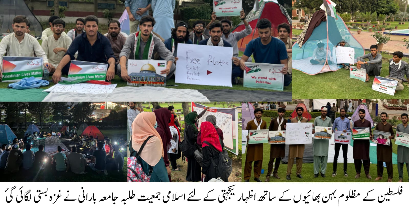فلسطینی بہن بھائیوں سے اظہار یکجہتی کے لئے اسلامی جمعیت طلبہ جامعہ بارانی کی جانب سےوائس چانسلر لان میں غزہ بستی لگائی گئی