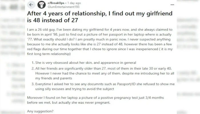 نوجوان نے اپنی کہانی ریڈٹ (Reddit) پر شیئر کی، جہاں اس نے بتایا کہ وہ خاتون کے ساتھ گزشتہ چار سال سے تعلق میں تھا۔ خاتون نے دعویٰ کیا تھا کہ اس کی تاریخِ پیدائش اپریل 1998 ہے، مگر حقیقت اُس وقت سامنے آئی جب اتفاقاً اس کے لیپ ٹاپ میں ایک پاسپورٹ کی تصویر دیکھی گئی — جس میں سالِ پیدائش 1977 درج تھا!